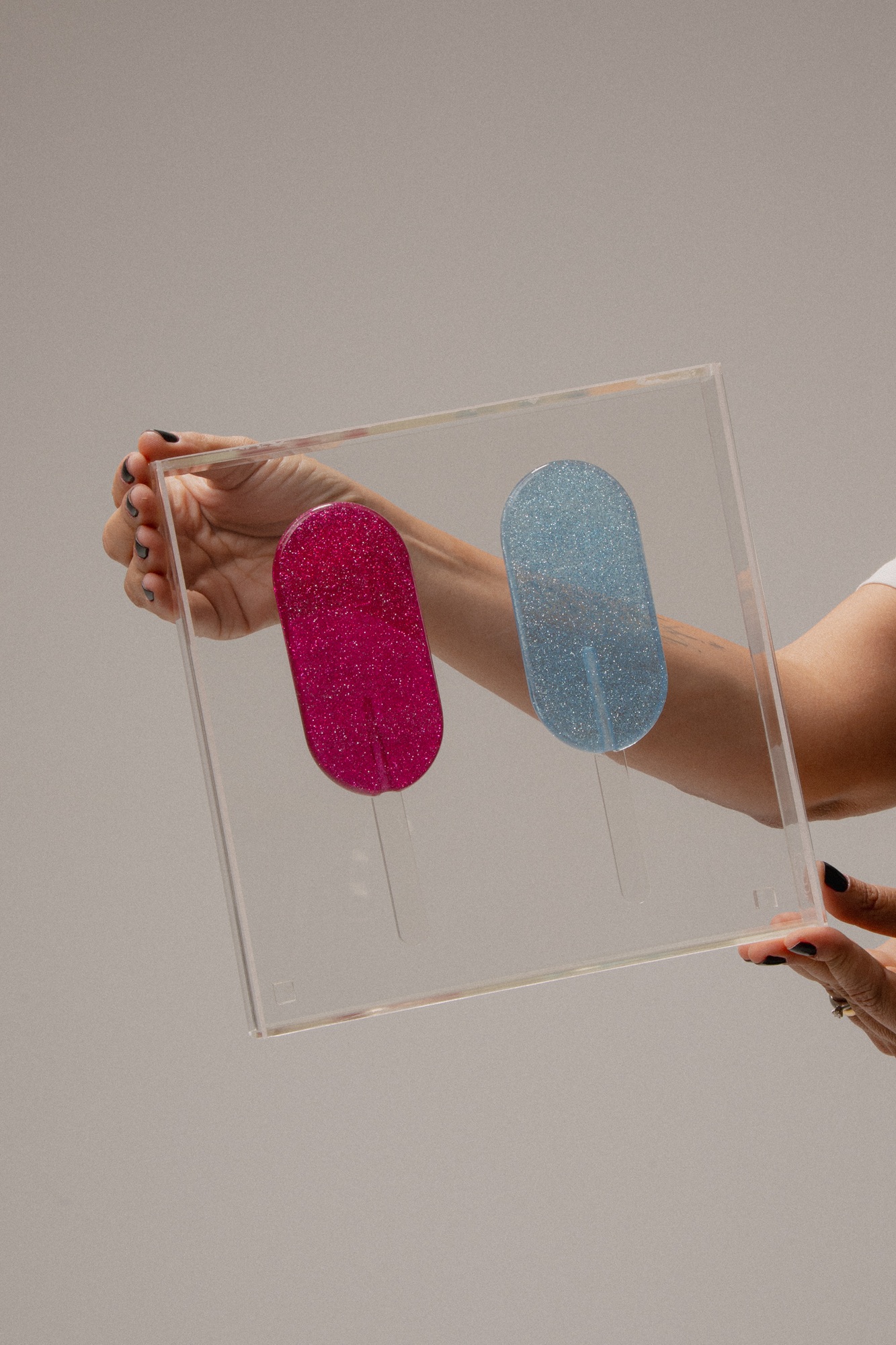 Nossos acrílicos ficam lindos sozinhos ou em uma composição na parede, assim como apoiados em bancadas, aparadores, mesa de centro ou em cima de livros e objetos decorativos.