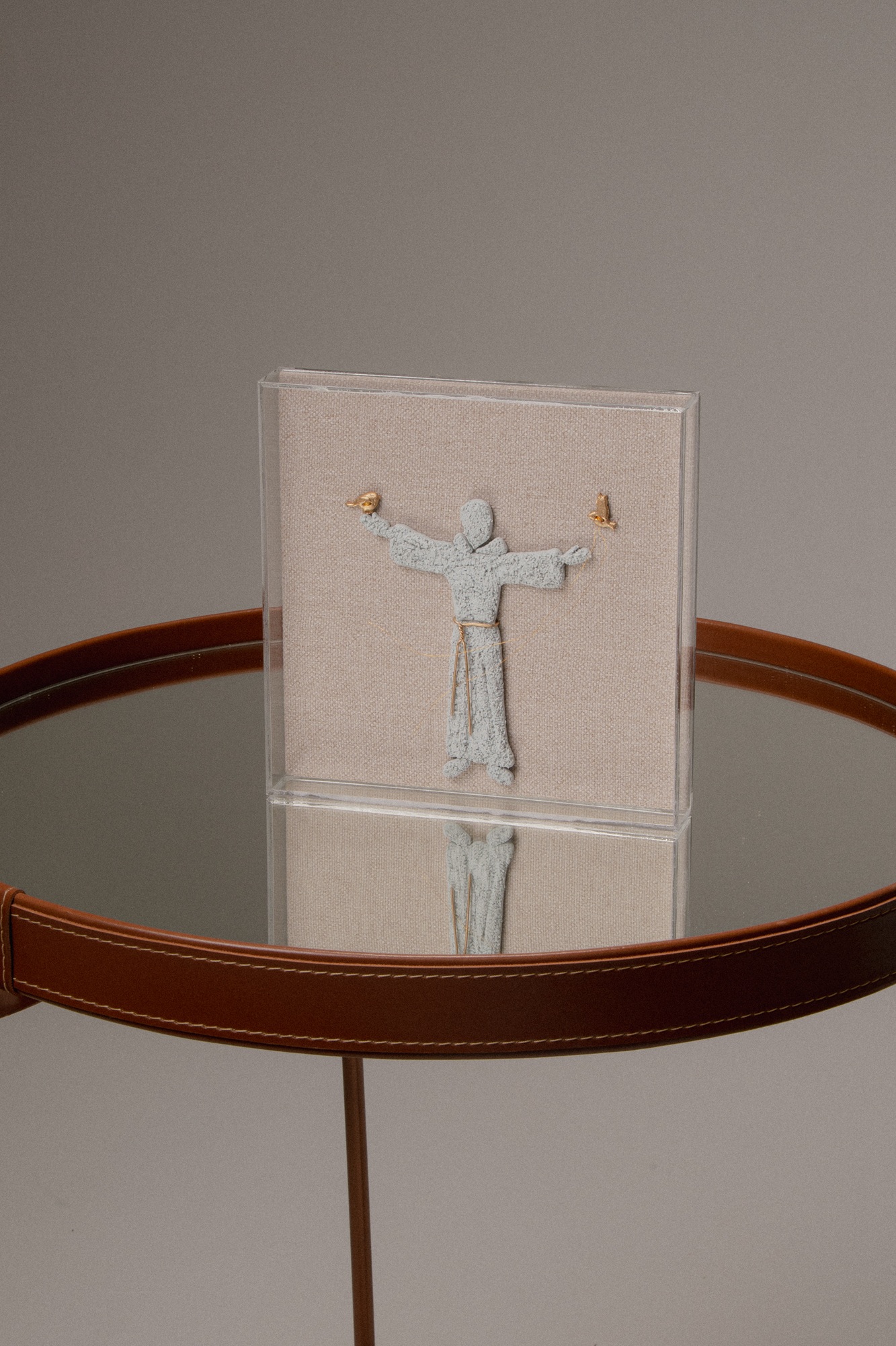 As peças, em acrílico, gesso e linho, carregam formas puras e significados profundos. São gestos mínimos que tocam grandes verdades: o nascimento divino, a conexão invisível do amor, a proteção de símbolos ancestrais.
